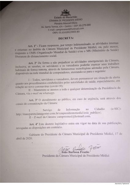 Aproveitando a quarentena o presidente da Câmara de Presidente Médici/MA, vereador Galo Roco – João Barbosa Frazão (56 anos) fez um decreto ilegal determinando o fechamento da Câmara Municipal por tempo indeterminado.