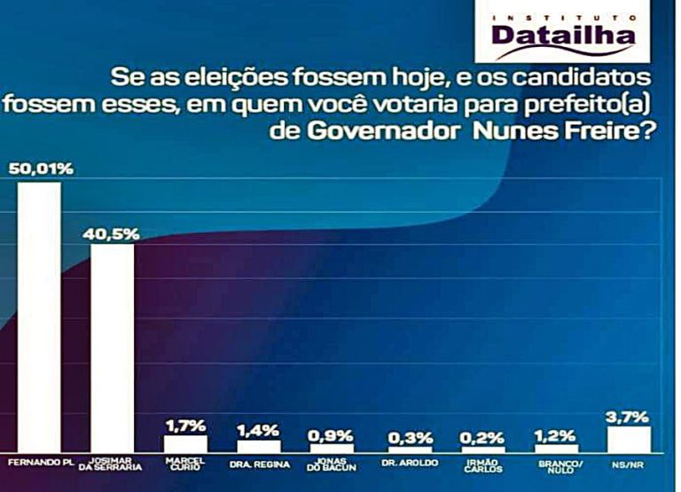 Em recente pesquisa do instituto Data Ilha de São Luís, Fernando PL, candidato a prefeito de Governador Nunes Freire e que conta com o apoio dos deputados Josimar Maranhãozinho (federal) e Detinha (estadual), venceria as eleições. Segundo a pesquisa, com registro no TSE MA – 01506/2020, Fernando PL tem 50,1% das intenções dos votos, o segundo colocado, o ex-prefeito Josimar da Serraria, aparece com 40,5%. Na pesquisa anterior, do instituto BMO (Brasil Marketing e Opinião), Fernando PL aparecia com 48,9%, contra 40,7% do seu principal concorrente, o que demostra que o candidato dos deputados vem crescendo a cada nova avaliação.