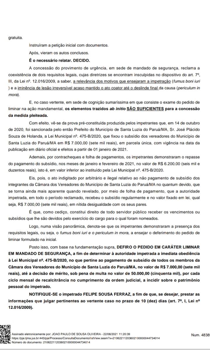 A decisão do juiz saiu nesta semana e obriga Felipe a pagar os valores retroativos a cada vereador lesado com os descontos. O vereador Felipe tentou todos os dispositivos na tentativa de fazer com que os demais vereadores ficassem impossibilitados de checar a prestação de contas da Câmara mas não conseguiu se desvencilhar. Na decisão, o juiz da Comarca ainda define que, caso o presidente da casa ouse descumprir a decisão, este poderá estar sujeito a multa de R$ 50 mil/mês.