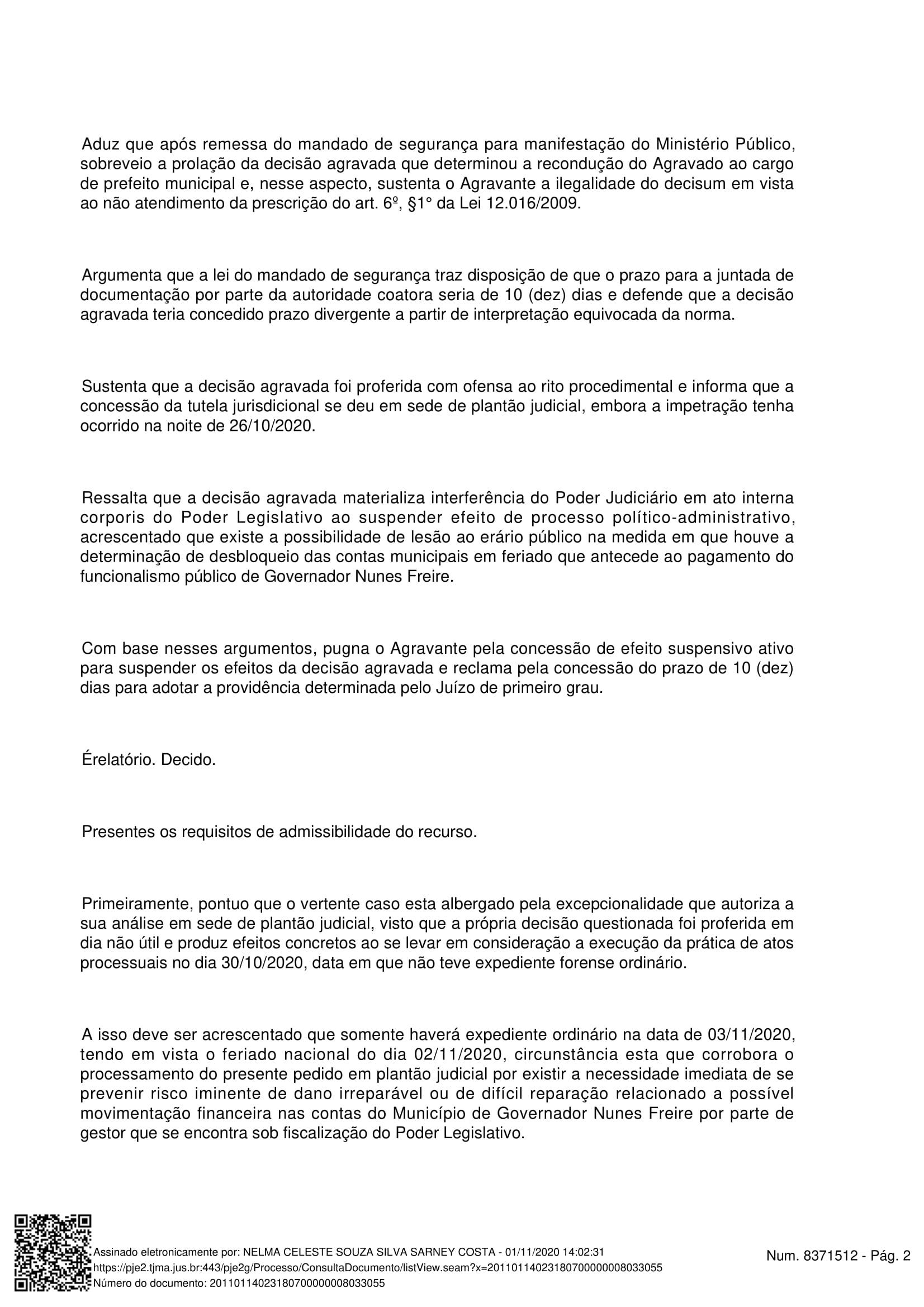 Na decisão, cabe o destaque para a ressalva da validade do ato praticado pelo poder legislativo, que faz com que o vereador Luis Fernando Pereira retorne ao cargo de prefeito municipal, a desembargadora opinou também pelo bloqueio parcial das contas do município de Governador Nunes Freire, a fim de evitar movimentações irregulares, resguardado o necessário para arcar com o pagamento do funcionalismo público.