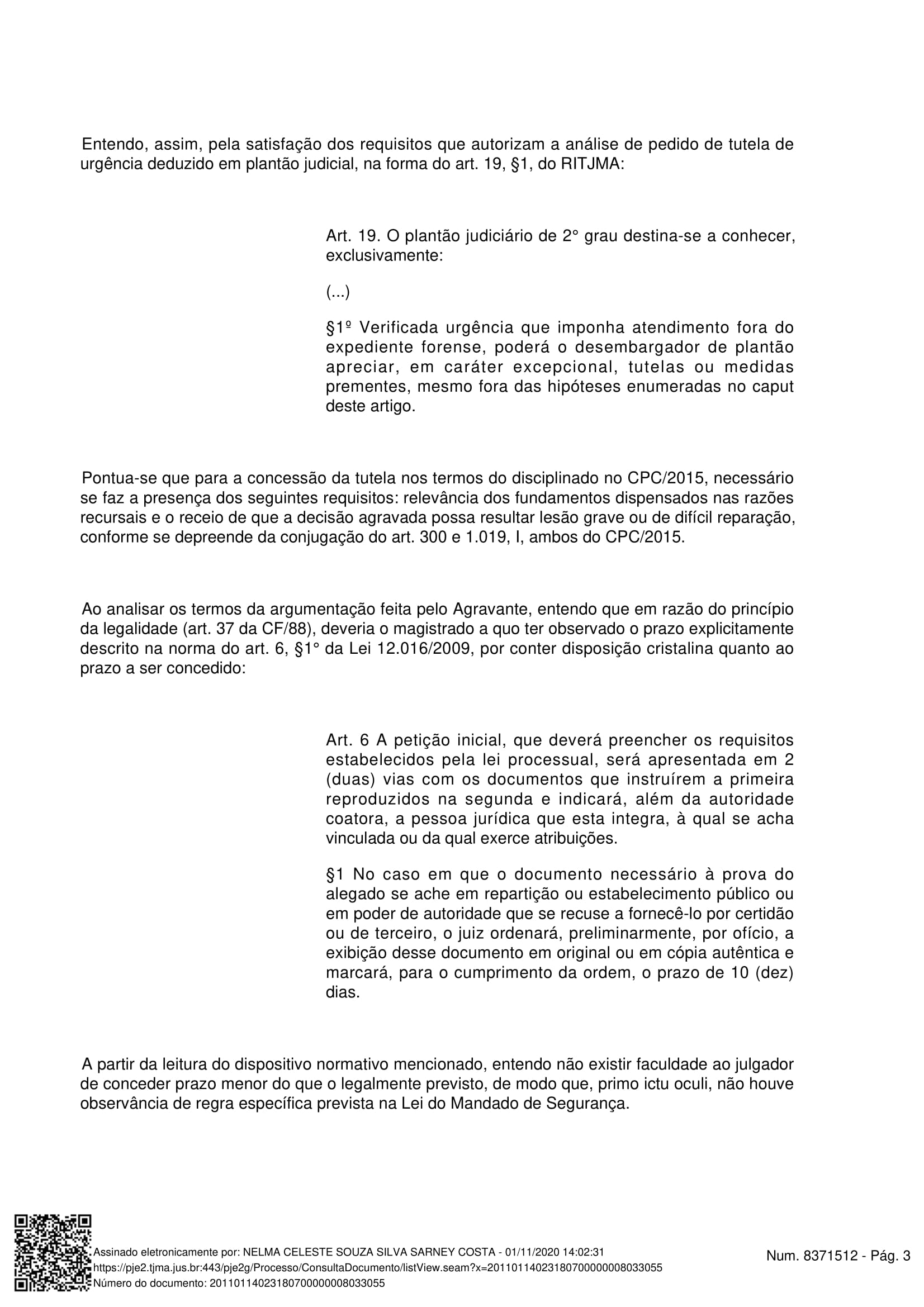 A desembargadora destacou nos autos que, havia um risco eminente de dano irreparável ou de difícil reparação relacionado a possível movimentação financeira nas contas do município de Governador Nunes Freire, por parte de Serraria, e ressalta que não vislumbrou qualquer ilegalidade no ato oriundo de fiscalização do poder legislativo municipal. No entender da desembargadora plantonista, o ato do poder judiciário de ingressar e promover a recondução de Serraria ao cargo de prefeito foi totalmente ilegal tendo em vista que não havia provas contundentes da ilegalidade do ato interno da Câmara para uma eventual suspensão.
