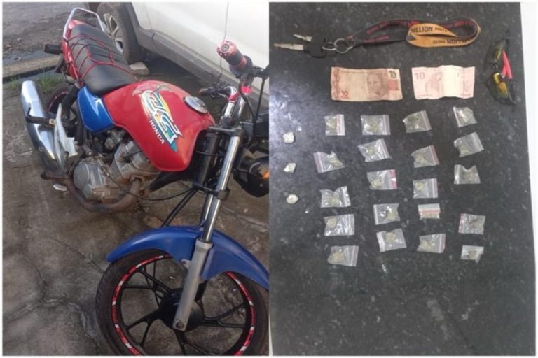 Durante a ação, os policiais encontraram 23 porções de substância análoga à maconha, além de R$ 20,00 em espécie e um óculos esportivo. A motocicleta usada pela dupla, uma Honda CG Titan de cor vermelha, estava sem placa e com o chassi ilegível, o que levanta suspeitas adicionais sobre sua origem.