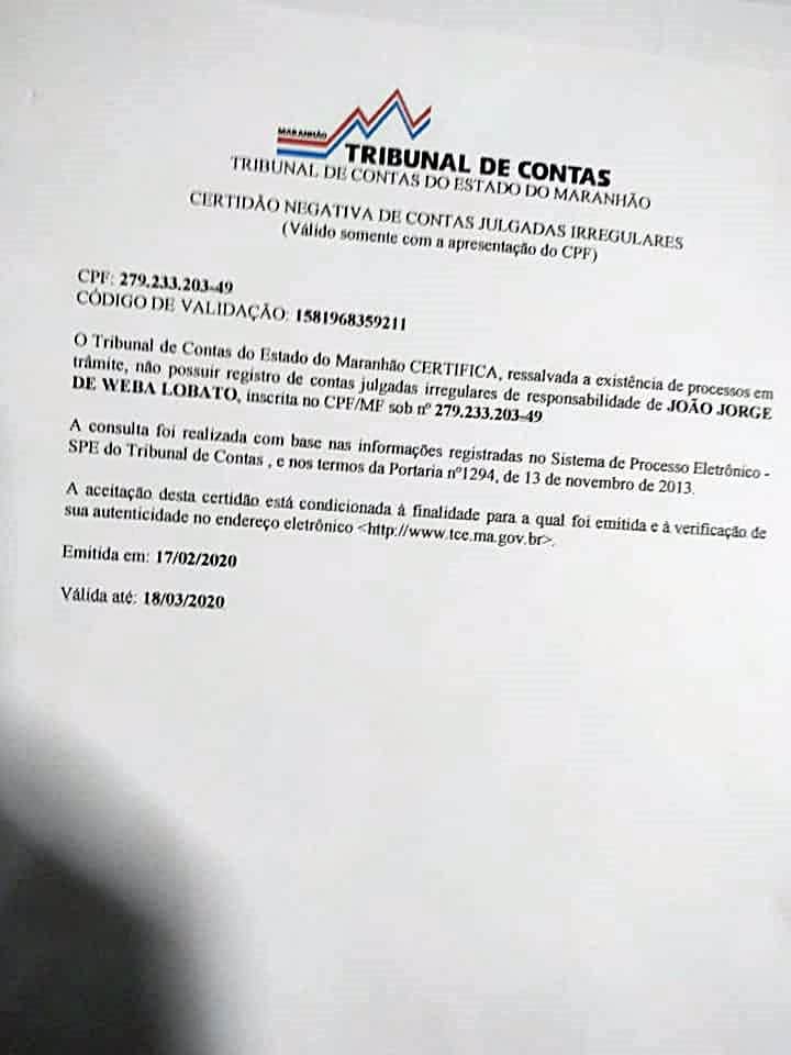 Em certidão negativa emitida pelo Tribunal de Contas do Estado do Maranhão TCE o órgão confirma não haver nenhuma conta julgada irregular definitivamente em nome do ex prefeito João Jorge W. Lobato. Lembrando que ainda que persistisse, cabe recursos, mas a palavra final seria da câmara municipal, o ex prefeito está apto a concorrer qualquer cargo público que assim o almejar, Lobato que é pré candidato a prefeitura de Santa Helena é também favorito a vencer a disputa na opinião absoluta da maioria dos eleitores helenenses e isso tem causado uma ciumeira nós adversários que tentam a todo custo, espalhar boatos com fake news nas redes sociais a respeito da pré candidatura do ex prefeito, algo que vem sendo desmascarado todos os dias pelo povo e agora pelo TCE.