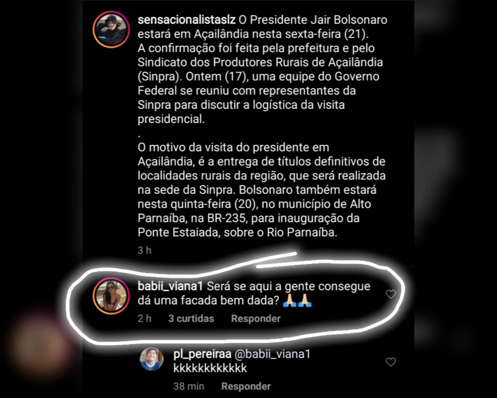 O comentário foi encorporado a postagem do perfil @sensacionalistaslz, após o autor da postagem informar que o presidente Jair Messias Bolsonaro estaria nos próximos dias visitando o estado do Maranhão.