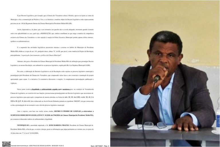 O Juiz da Comarca de Santa Luzia do Paruá/MA, João Paulo de Sousa Oliveira, proferiu Decisão Liminar suspendendo o ato do Presidente de Câmara de Presidente Médici/MA que no último dia 17/04 suspendeu ilegalmente todos os trabalhos do Poder Legislativo por tempo indeterminado.