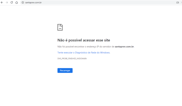 Em consulta aos dados do domínio www.santaprev.com.br e em contato com a empresa de hospedagem responsável (HOMEHOST), nossa redação constatou que o site foi retirado do ar PROPOSITALMENTE desde novembro de 2019 quando deveria ter pago uma pequena taxa para manter o site no ar, este até o presente momento se encontra desativado.