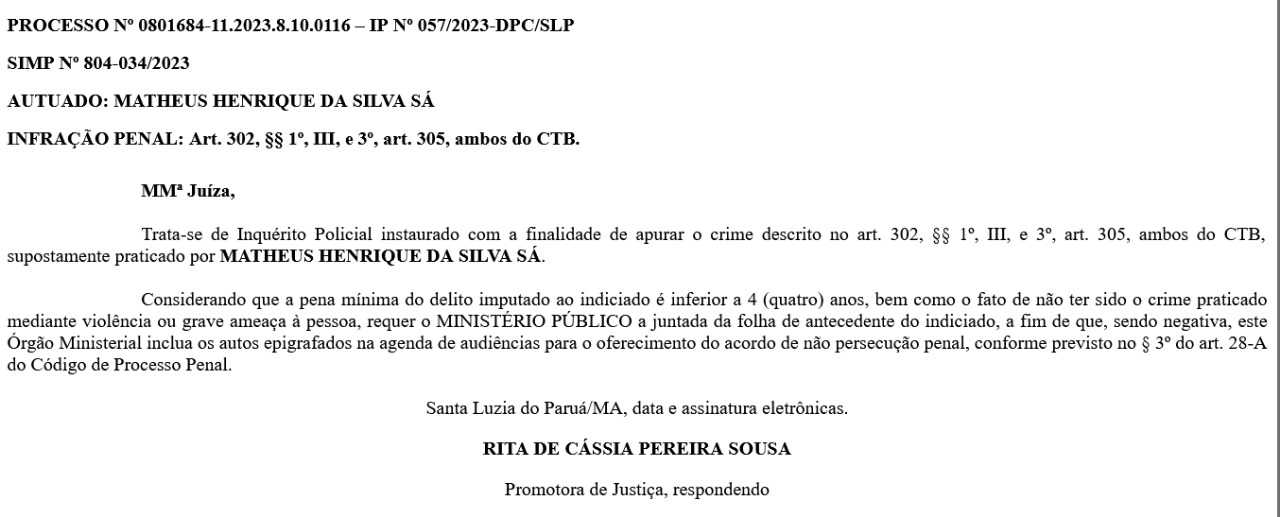 Respondendo pela Comarca de Santa Luzia do Paruá, a promotora empossada com base no concurso de 2019, Rita de Cássia Pereira Souza encaminhou documento à juiza que responde temporariamente pela Comarca dando seu parecer sobre o caso envolvendo o acidente envolvendo o advogado Matheus Lacerda, que acabou culminando na morte de Wellington Caetano. No documento a promotora erra inclusive a tipificação penal do caso, anulando a preterdolosidade (que é quando o autor assume o risco de matar como no caso em que o advogado mesmo após ingerir bebidas alcóolicas assumiu o volante da caminhonete), assim como crimes de omissão de socorro, ocultação de provas. Para mostrar o agravante da situação, nossa redação irá postar nos próximos dias um video exclusivo do acusado ingerindo bebidas às margens do rio momentos antes do ocorrido que vitimou Wellington Caetano, o que torna ainda mais obsoleta a recomendação desastrosa do MP.