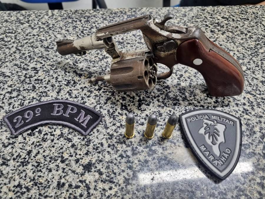 De imediato diligências foram realizadas em busca dos suspeitos, sendo encontrados nas proximidades do bairro Santa Terezinha. Ao realizar a abordagem, fora encontrado com os três individuos uma arma de fogo calibre 38 com três munições não deflagradas.